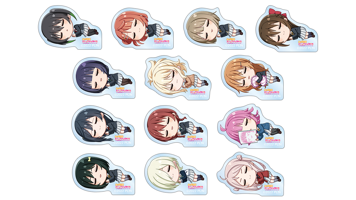 高咲 侑、上原 歩夢、中須 かすみ、桜坂 しずく、朝香 果林、宮下 愛、近江 彼方、優木 せつ菜、エマ・ヴェルデ、天王寺 璃奈、三船 栞子、ミア・テイラー、鐘 嵐珠をアクリルステッカーに仕上げました。