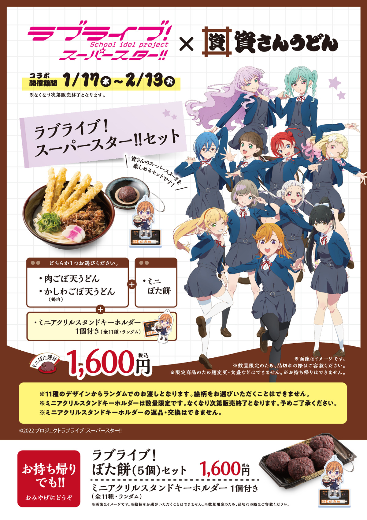・肉ごぼ天うどん+ミニぼた餅+ミニアクリルスタンドキーホルダー1個(全11種:ランダム) 1,600円(税込)