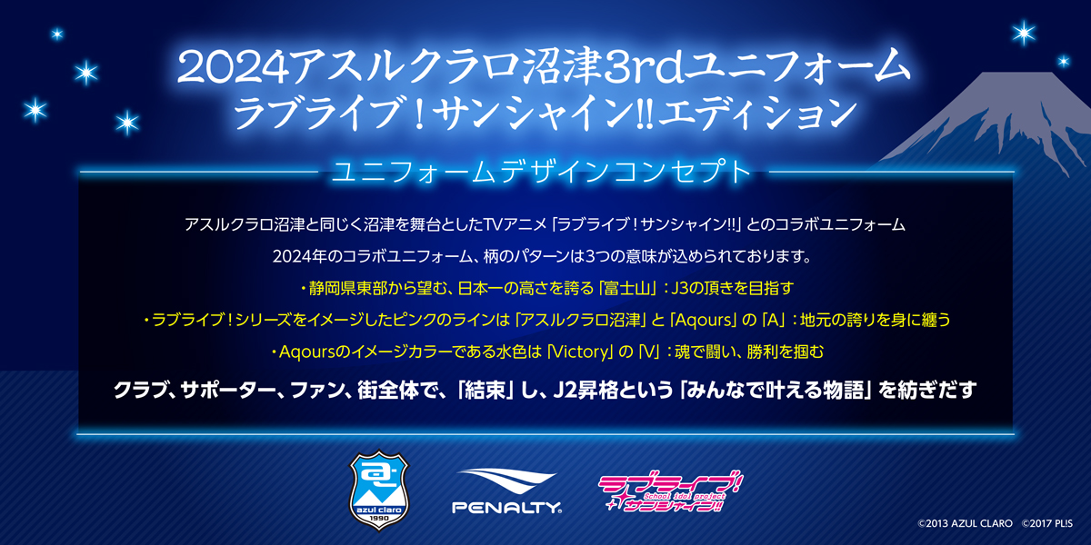 プロジェクトラブライブ!サンシャイン!!がオフィシャルパートナーとなっている沼津のサッカーチーム、アスルクラロ沼津とのコラボユニフォームが昨シーズンに続き、2024シーズンも展開することになりました!