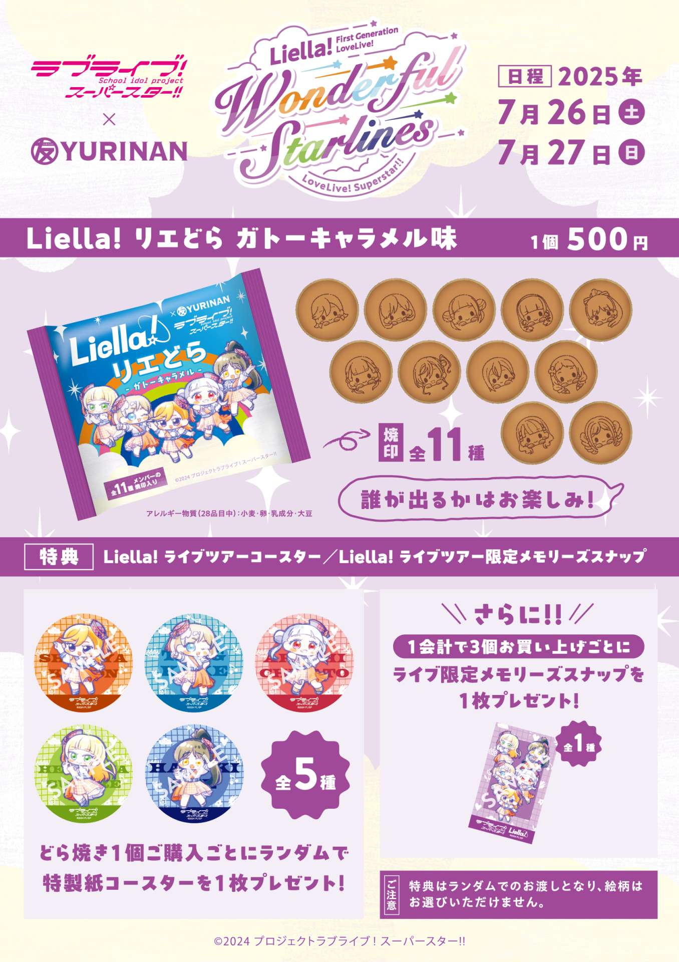 <東京公演>では、どら焼き1個ご購入ごとに特製紙コースター(A・Bのいずれかをお選びいただき)をランダムで1枚プレゼント!